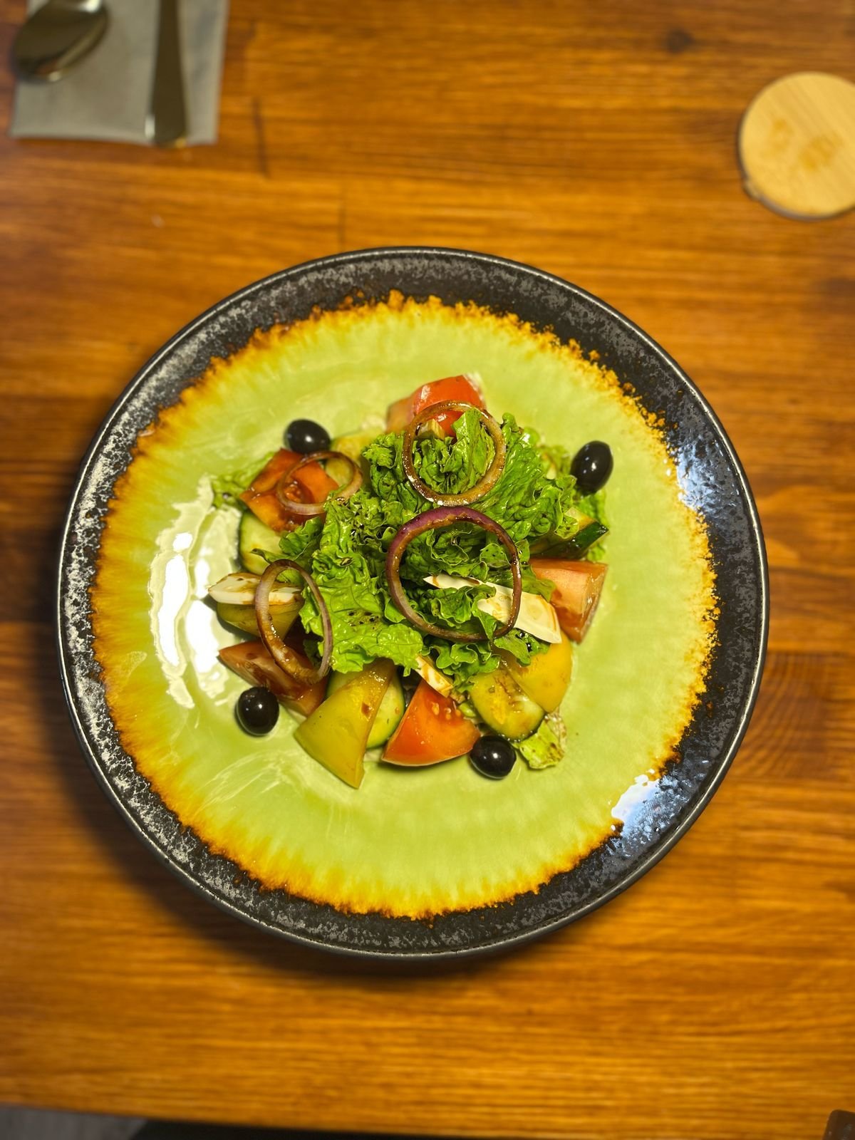 помидоры , огурцы, перец светофор, айсберг, листья салата, маслины, лук красный, фетакса