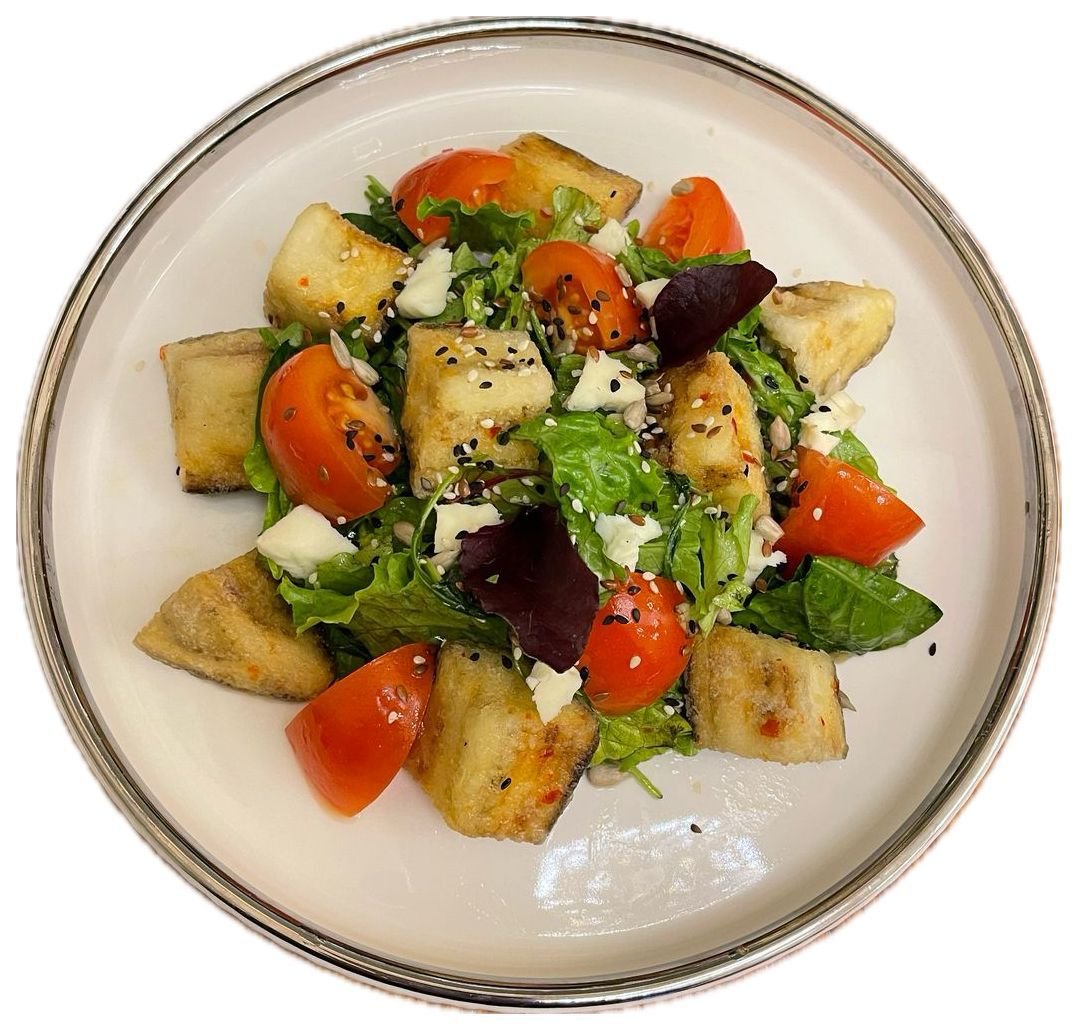 шпинат, листья салата, кинза, мята, баклажан, помидор, крахмал кукурузный, козий сыр, красное масло, зеленое масло, соус свичили