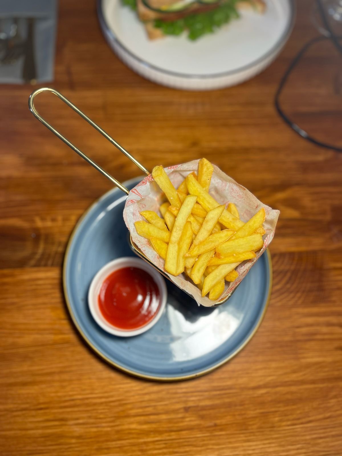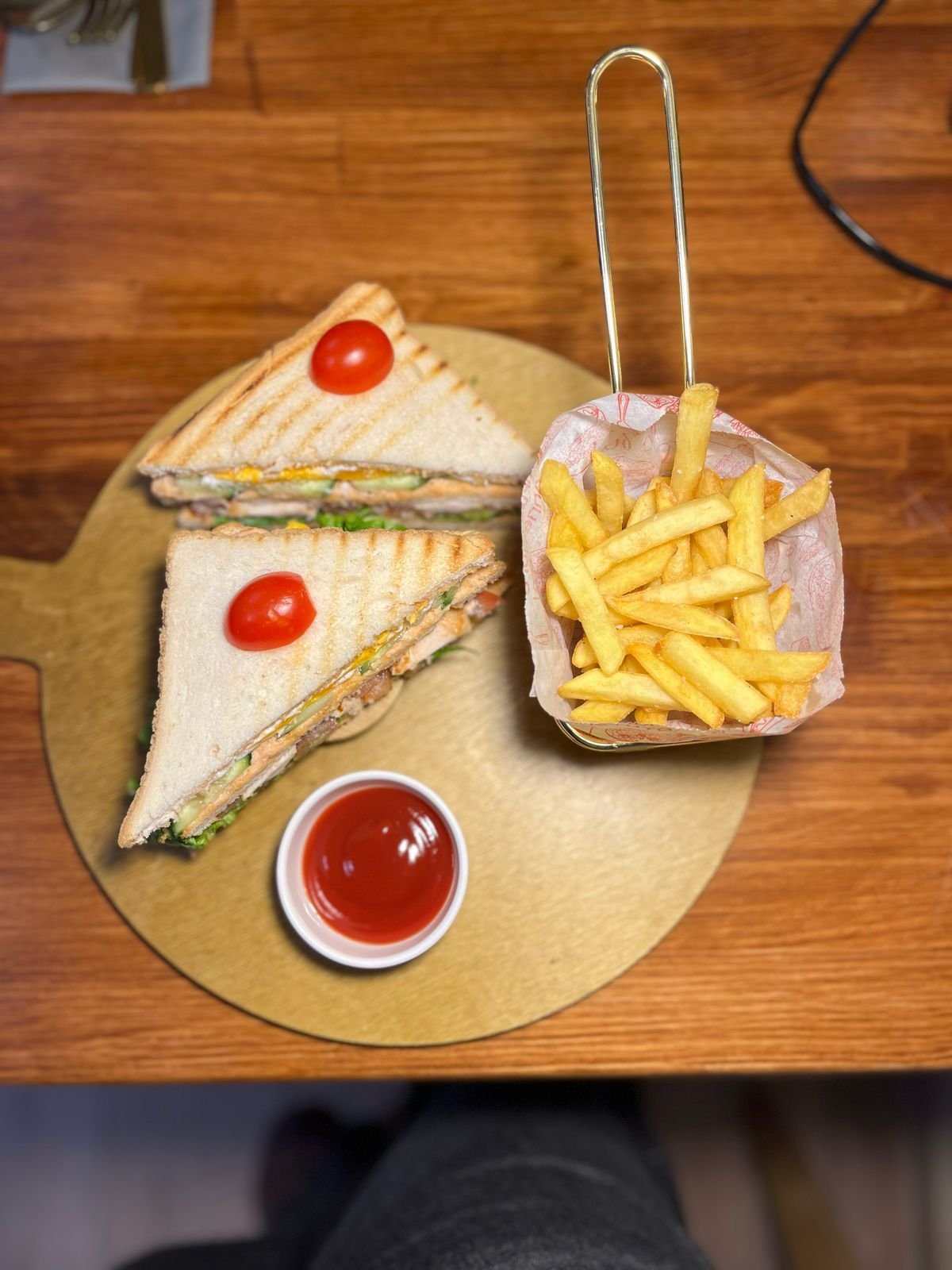 Тостерный хлеб, шпинат, помидор, огурцы, куриное филе, лист салата, картофель фри, кетчуп