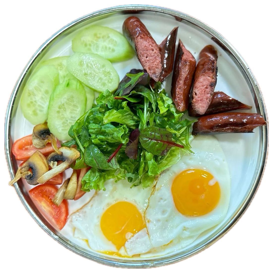 Яйца, колбаски охотничие, помидоры, огурцы, микс салат, шампиньон