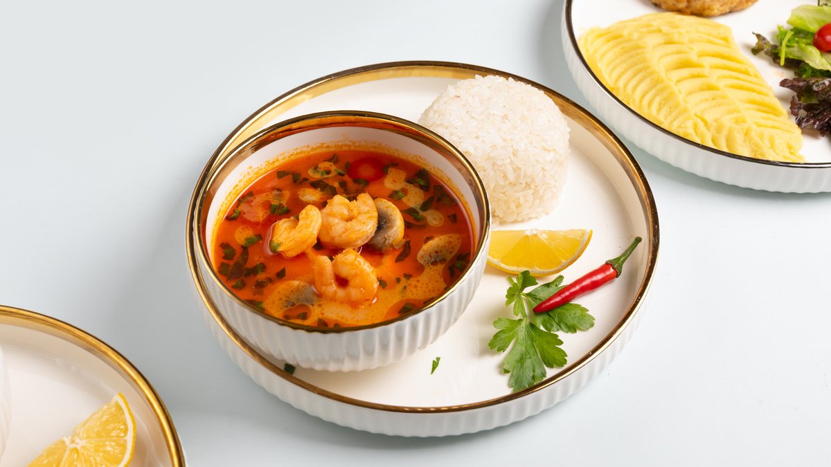 Лимограсс, кочудян, галангал, креветки, шампиньон, лимон, помидоры черри, кинза, стручковый перец, рис