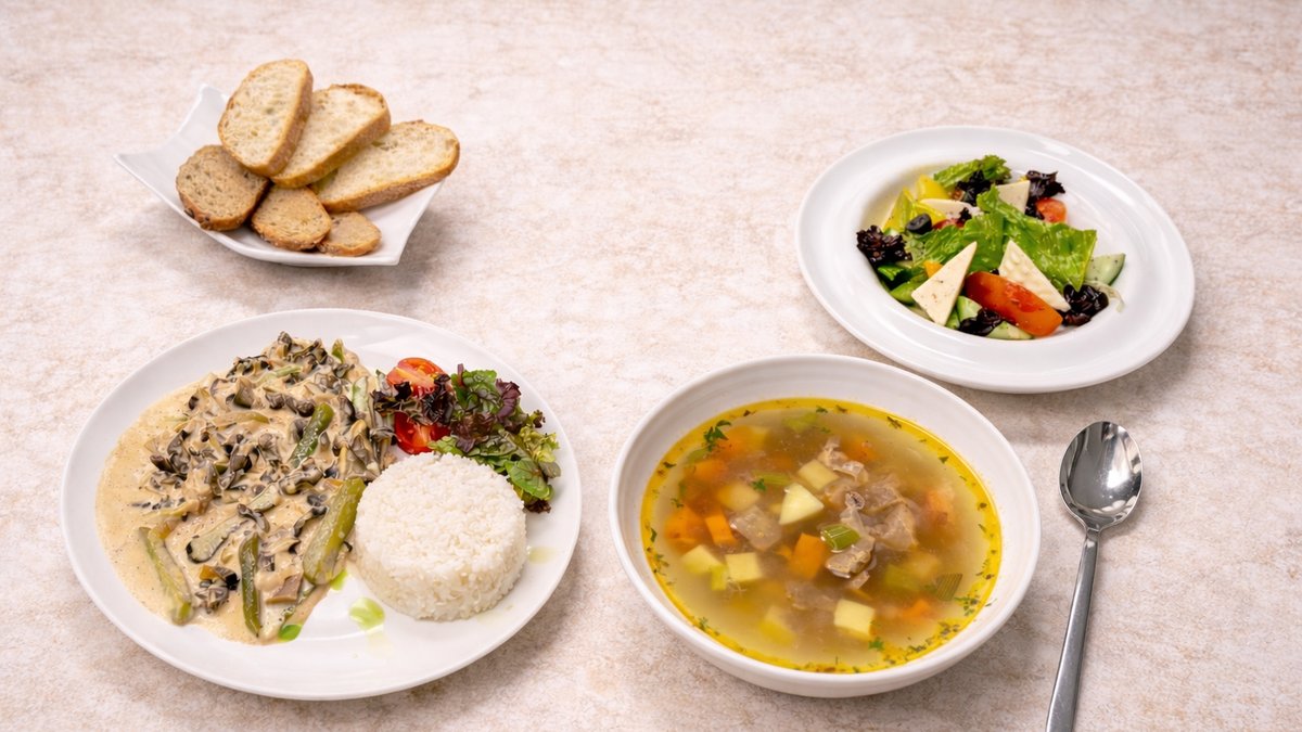 Суп говяжий – 250 г Бефстроганов с рисом – 400 г Салат греческий – 200 г Баурсаки, чебуреки Финики Вода
