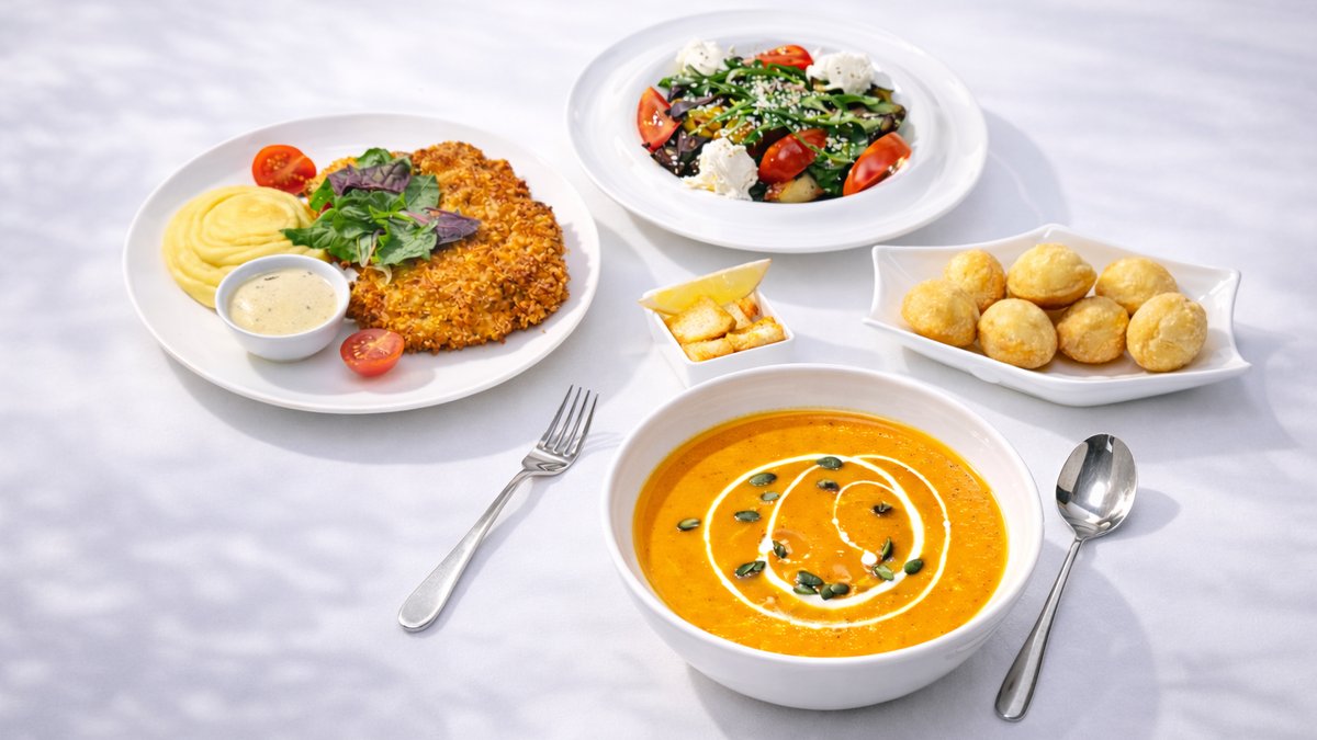 Суп тыквенный – 300 г Шницель с пюре – 400 г Хрустящие баклажаны с творожным сыром –150 гр Баурсаки, чебуреки Финики Вода