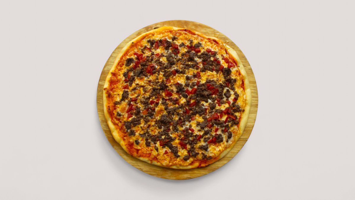 тесто, соус, сыр моцарелла, говяжий фарш с овощами, маслины