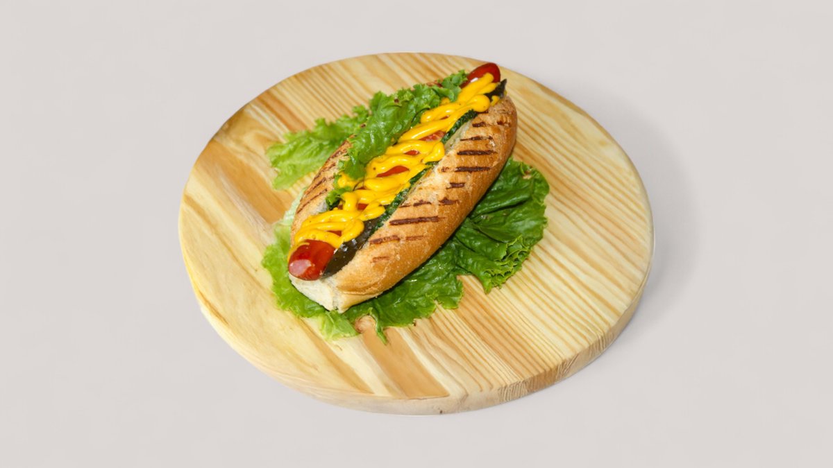 булочка, говяжья сосиска, салат, соус, горчица