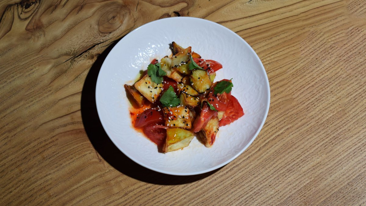 баклажан, помидоры, зеленый лук, азиатский соус, кинза