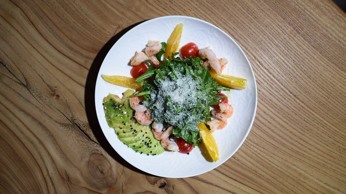Креветки, руккола, авокадо, сладкий соус чили с апельсином