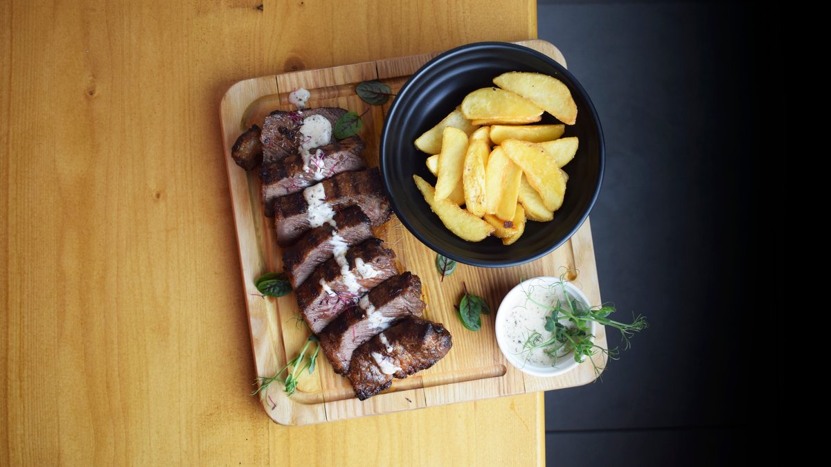 Мраморная говядина, картофельные дольки, перечный соус