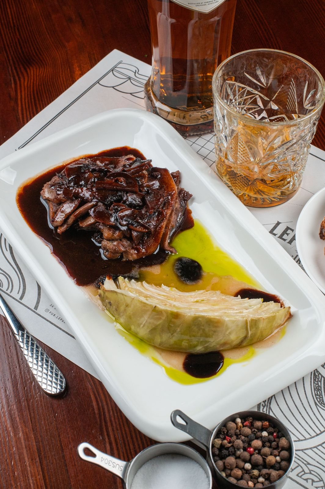 Томленный говяжий язык обжаренный в хоспере, со стейк из капусты на пару.