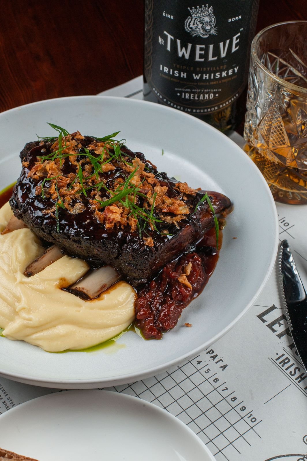 Томленное ребро конины с картофельным пюре, хрустящими луковыми чипсами и соусом демигласс.