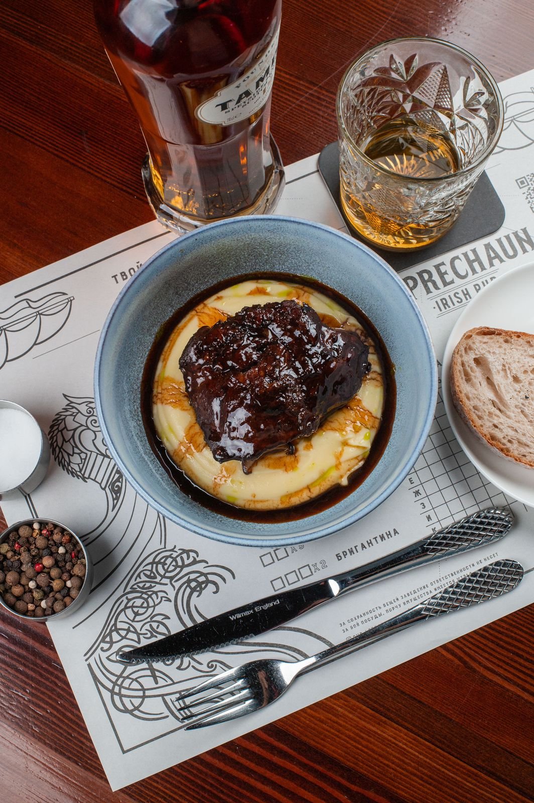 Томленная говяжья щека с картофельный крем-пюре и соусом демигласс.