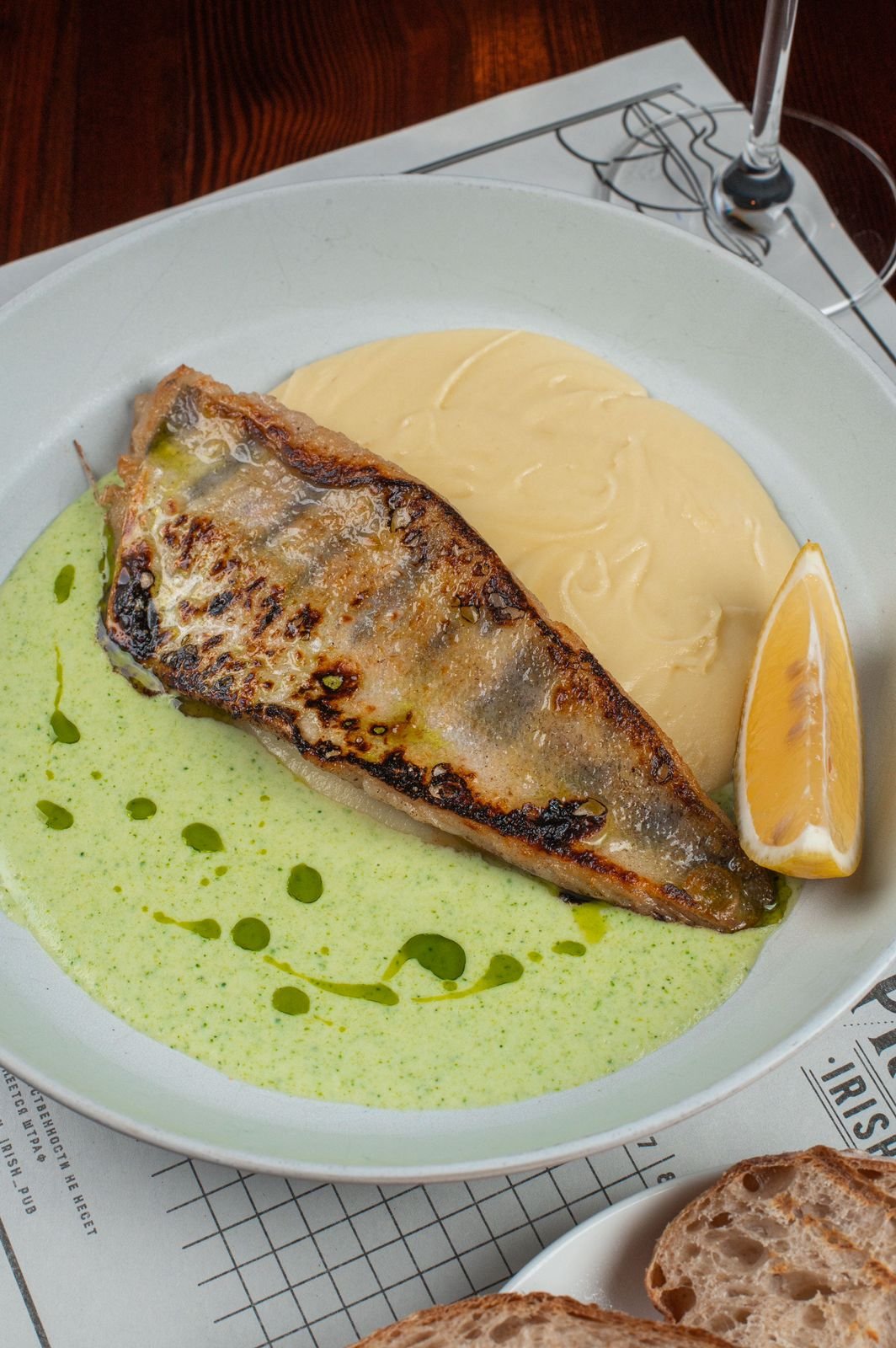 Филе судака с картофельным крем-пюре и нежным соусом из брокколи.