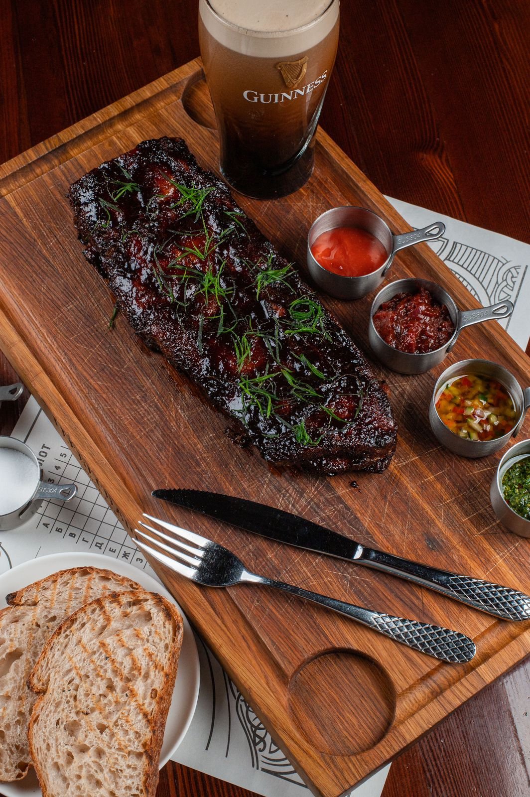 Время приготовления 1 час. Томленные свиные ребра в пивной глазури. Соус чимиррючи, диабло, сальсаверди.