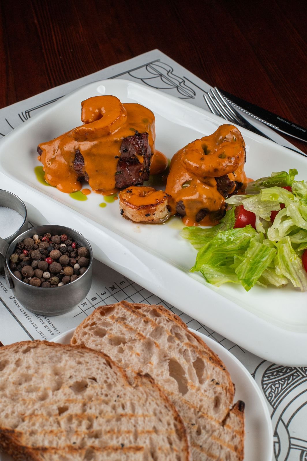 Говяжья вырезка с королевской креветкой и соусом том-ям.