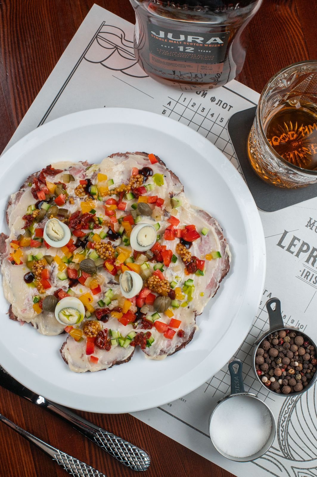 Говяжья вырезка с соусом Вителло Тоннато с овощями и маринованными яйцами.