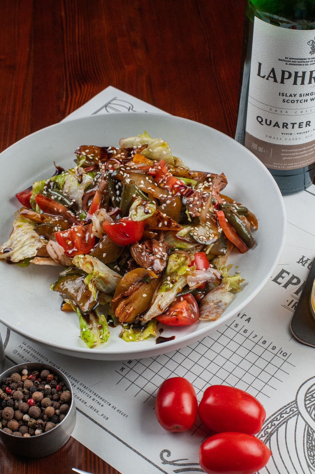 Баклажаны, помидоры, зелень, кунжут, соус терияки, устричный соус