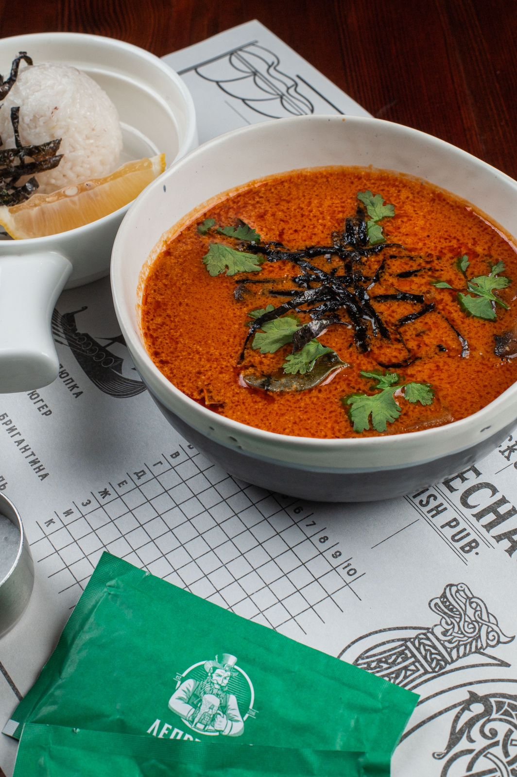 Паста Том ям,шампиньоны, мидии, королевские креветки, корень имбиря, лемонграсс кокосовые сливки. Рис отдельно.
