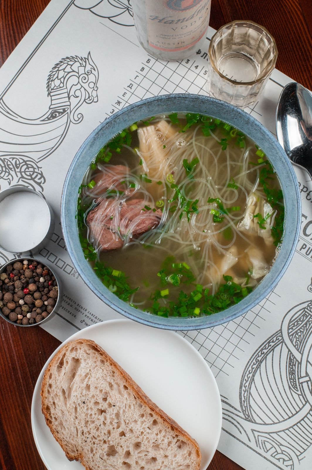 Бульон из говяжьей щеки, фунчеза, маринованная капуста, грибы грузди.