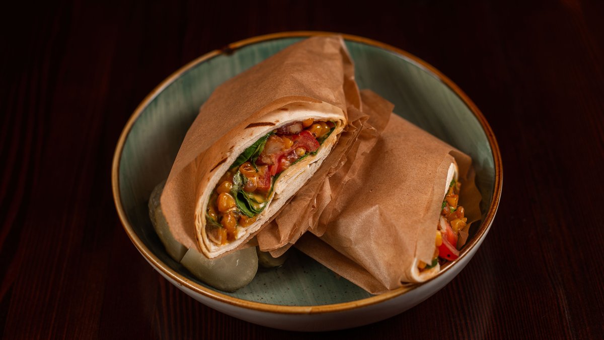 Тушеное говяжье мясо, помидоры, аджика, соус барбекю в пшеничной тартилье.