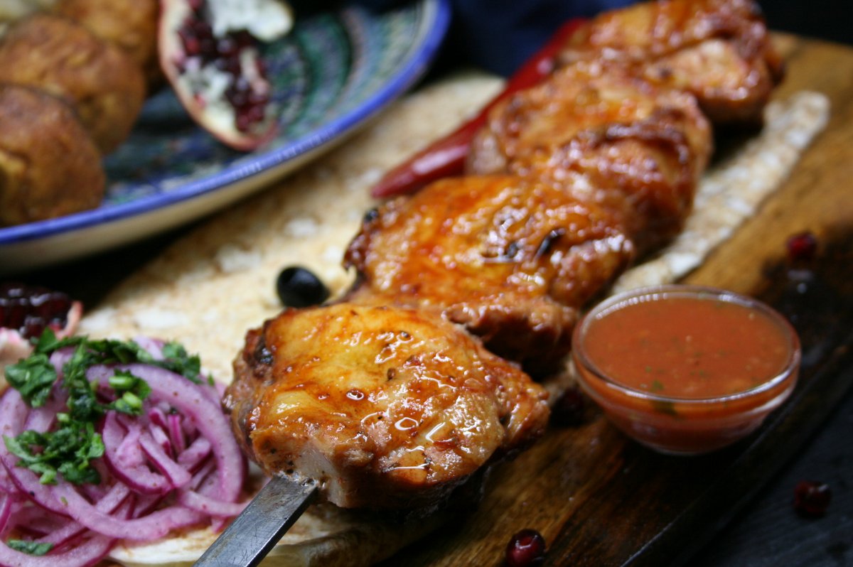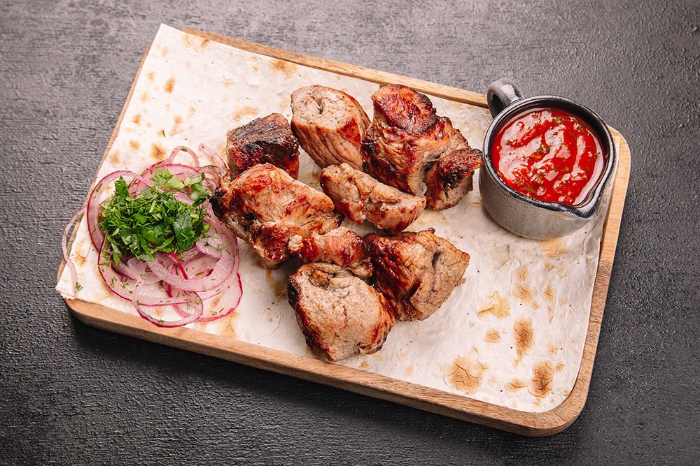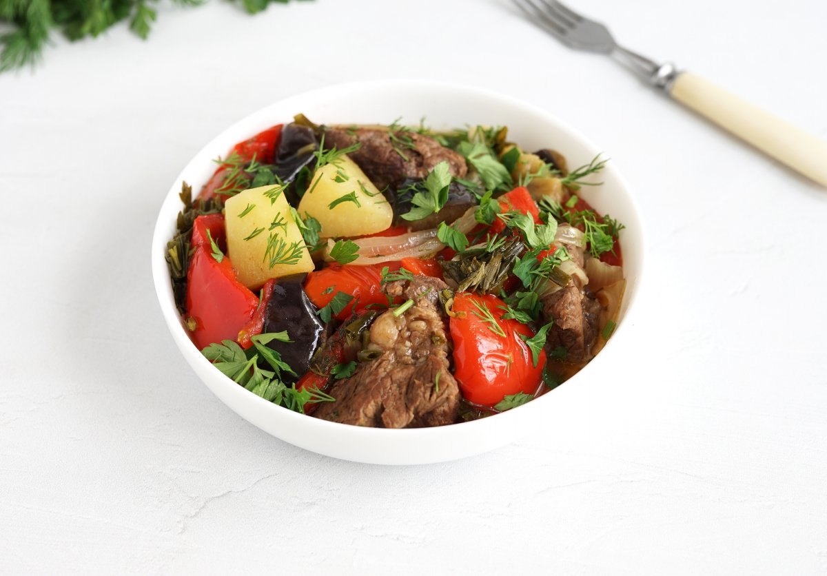 Баранина, специи, кинза, помидоры, перец болгарский, картошка, базилик