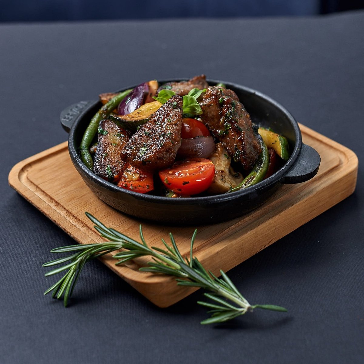 Говядина, помидоры черри, перец светофор, лук, зелень