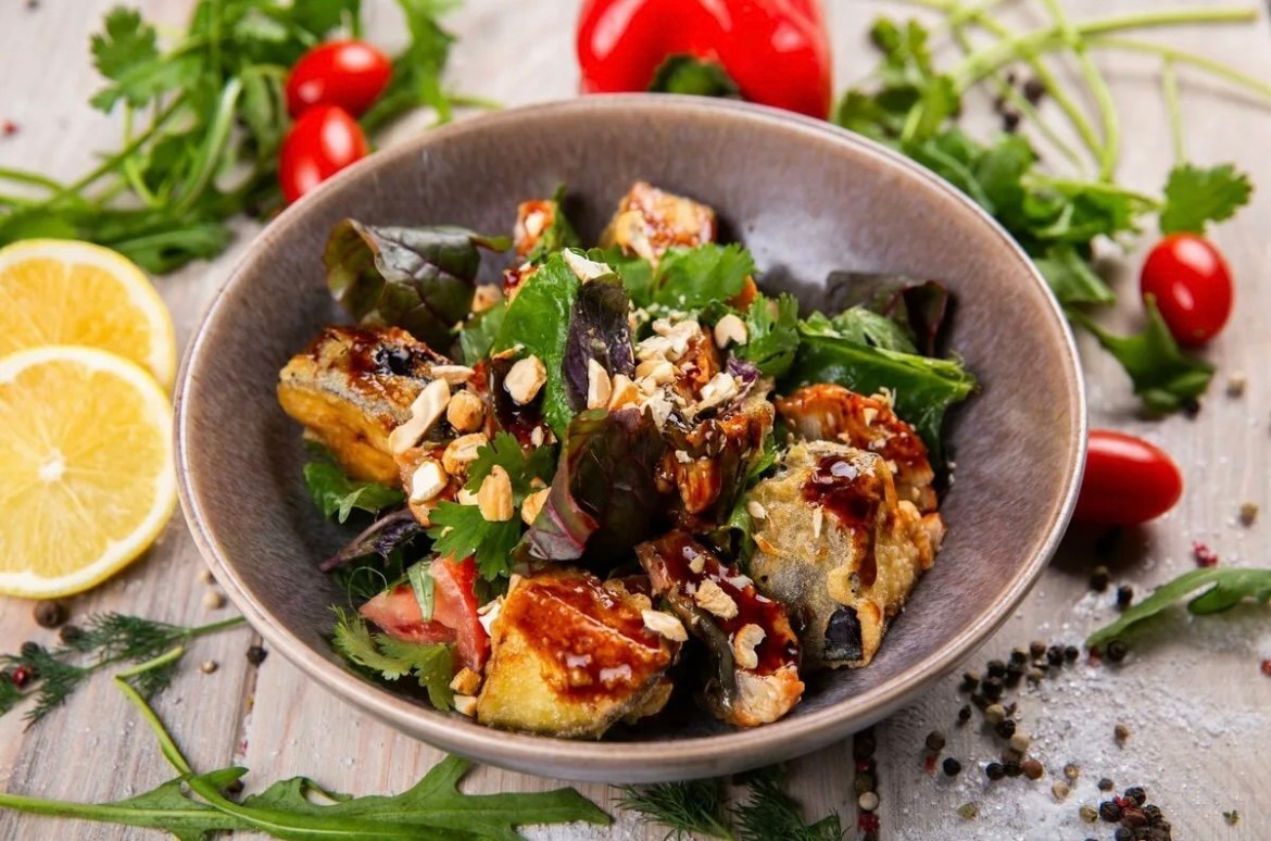 Рулетики из баклажан с пастой из грецких орехов (содержит лук и чеснок в небольшом количестве)
