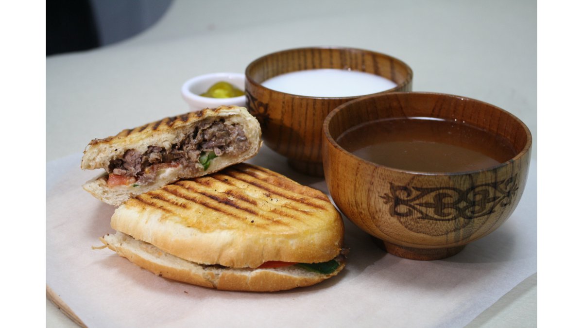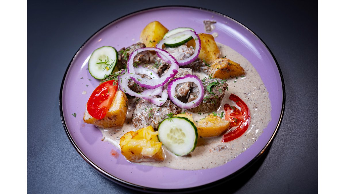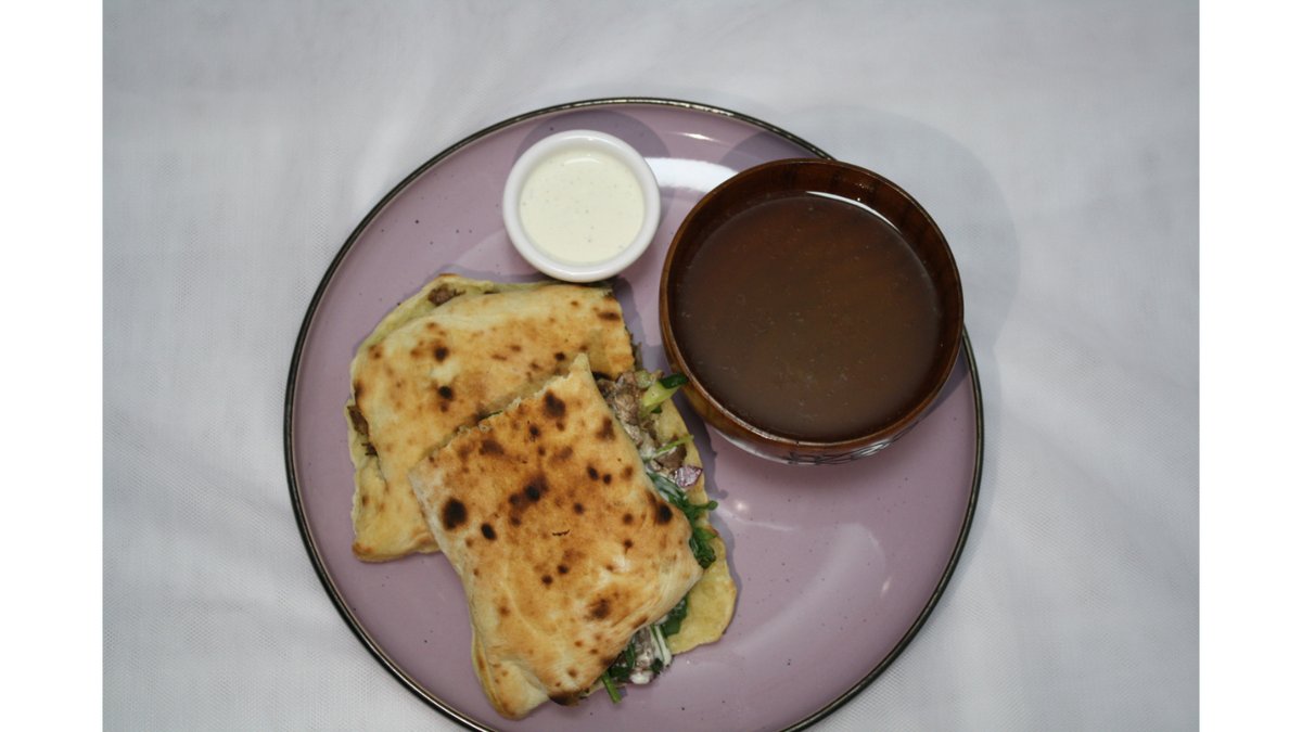 Жукпа нан (шелпек) , томленное говядина,помидор,огурец,соус фирменный