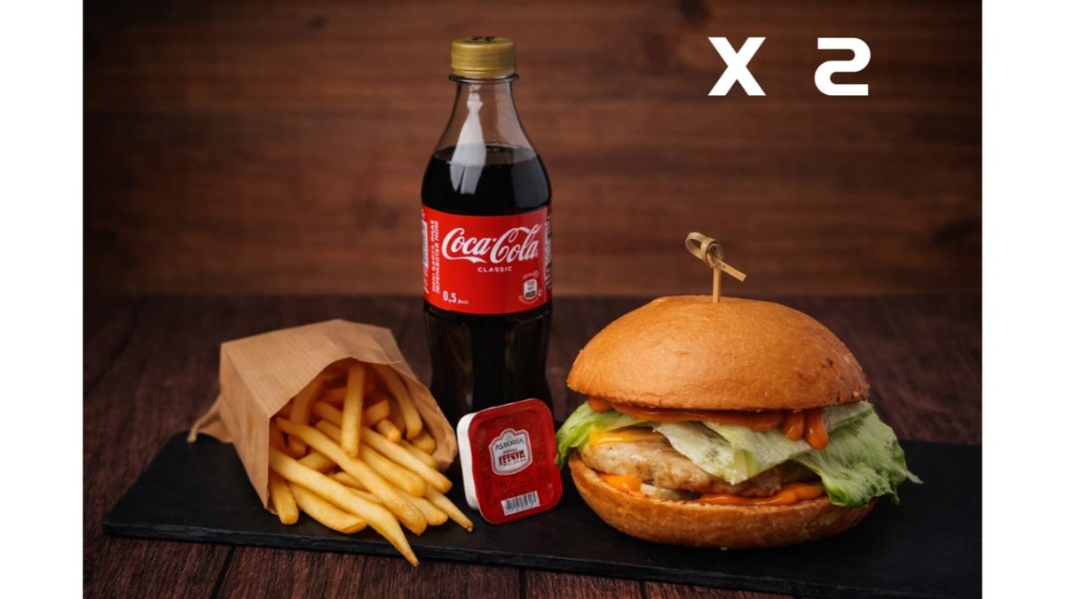 Бургер куриный (2 шт.)+Фри (2 порц.)+Coca-Cola(2шт.)+Соус (2 порц.)