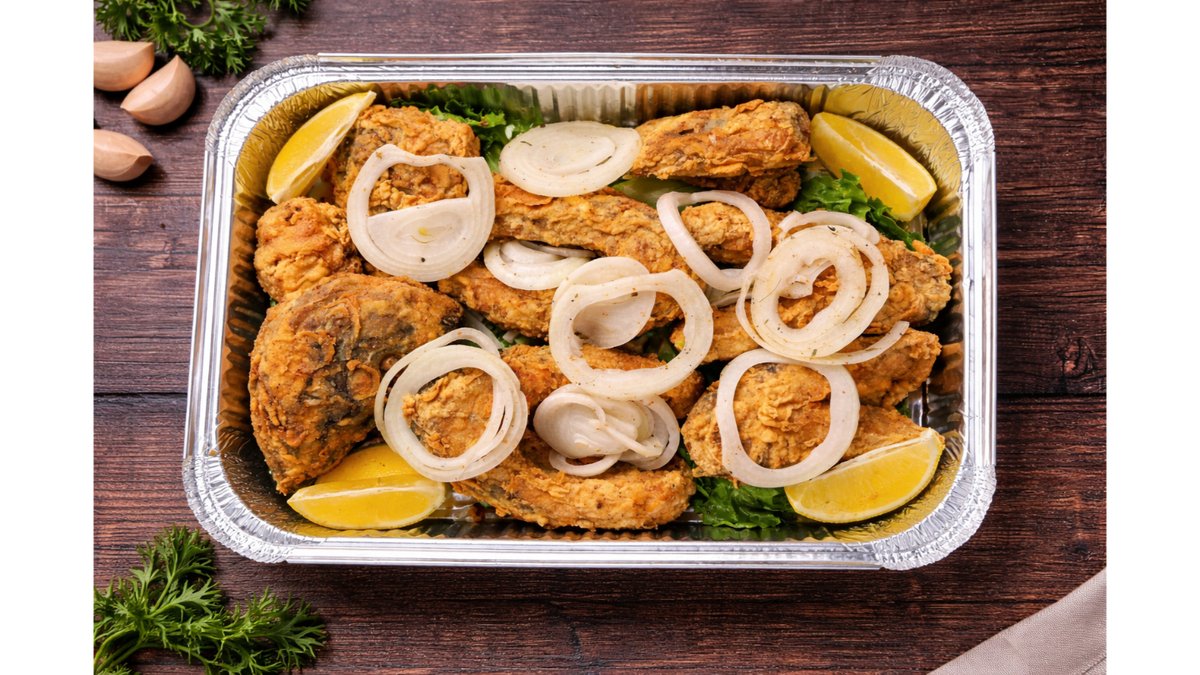 Жареный сазан с головой в кляре, маринованный лук, дольки лимона