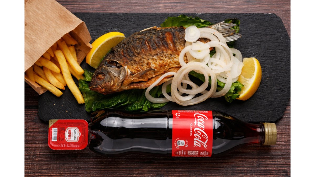 Жареный карась(1шт)+Картофельные дольки(150гр.)+Coca-Cola 500 мл+Соус