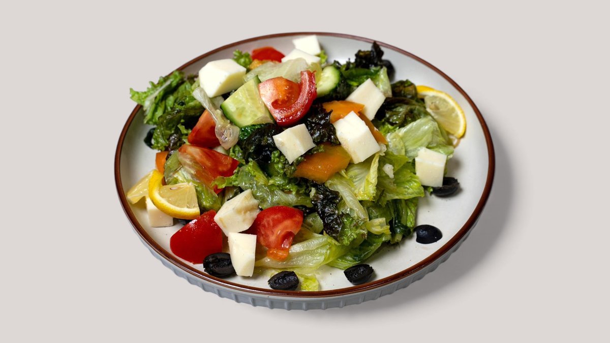 огурцы , помидоры , маслины , листья салата, лимон ,сыр фетакса ,болгарский перец ,оливковое масло