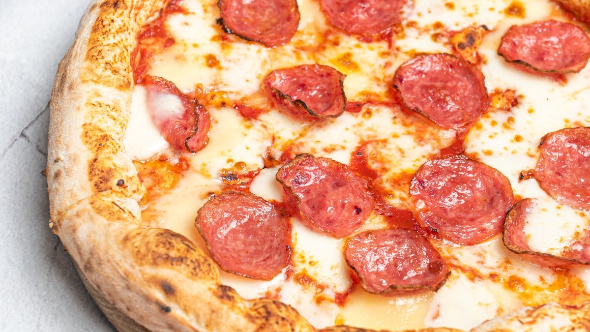 Ферментированное тесто, итальянская моцарелла, томатный соус, пепперони говяжьи . Выпекается при 457 градусах