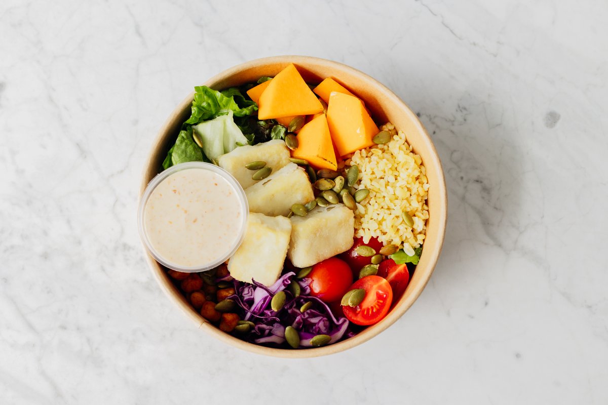 Салатный микс, булгур, сыр тофу в слабом кляре, помидоры, нут с паприкой, красная капуста, финики, тыква (запеченная)/кабачки (сезон), семечки тыквы, заправка финик & кунжут