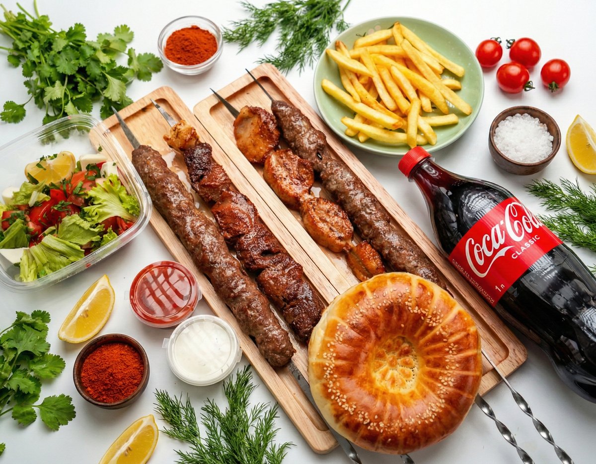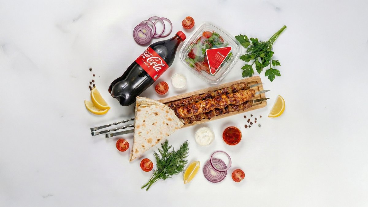 Люля-кебаб (3 шт.), салат (1 шт.), лаваш (2 шт.), соус (2 шт.), Coca-Cola (1 л, 1 шт.)