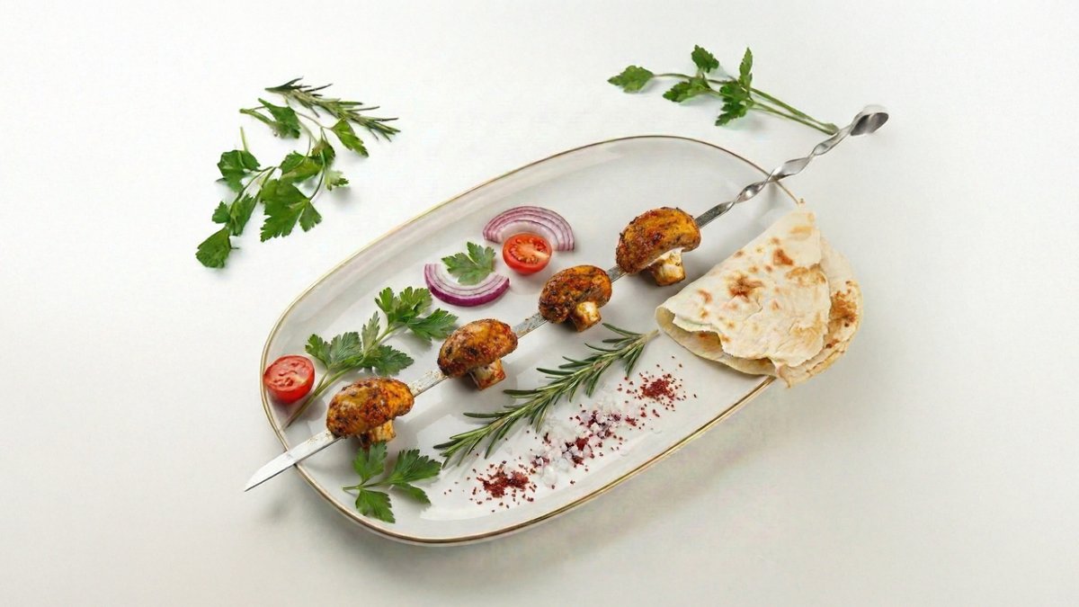 Шампиньоны обсыпаются маринадом из масла и приправ, затем жарятся на мангале до золотистой корочки