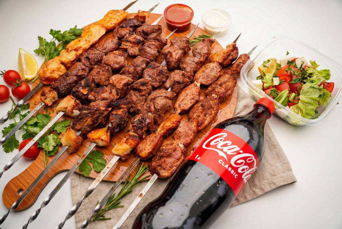 Куриный люля-кебаб - 2 порции Люля-кебаб - 2 порции Лепешка - 1 шт Кола - 1л Салат - 1 порция Соус - 2 шт