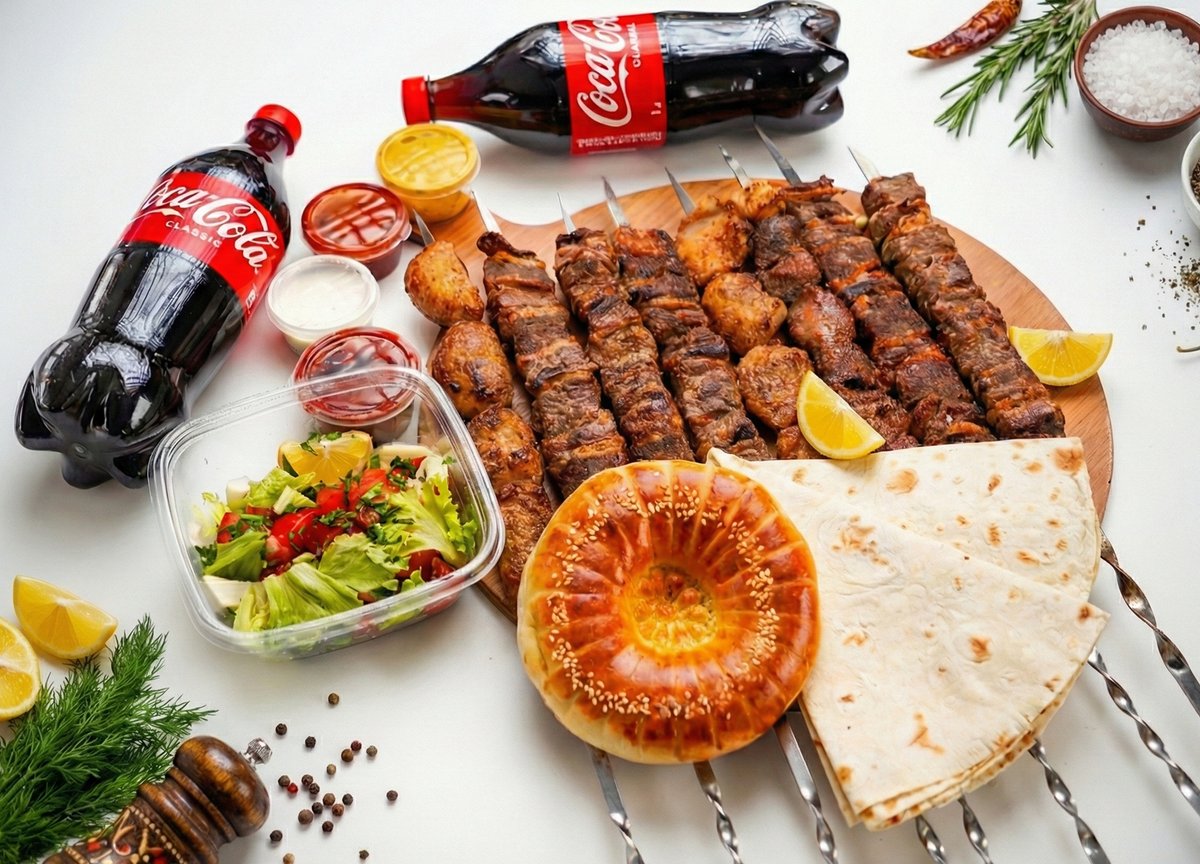 Баранина -1 порция Люля -кебаб -1 порция Шашлык из утки -1 порция Лепешка -1 шт Напиток - 1л Салат - 1 порция Картофель фри - 1 порция Соус - 2 шт