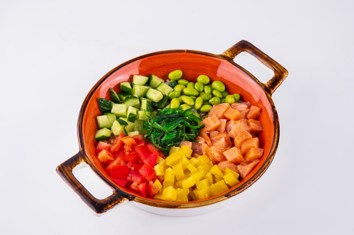 Жаренный тофу, телятина, огурцы, помидоры, лук репчатый, светофор