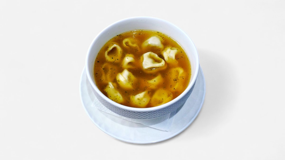 Пельмени из говядины разноцветные, бульон, подается со сметаной