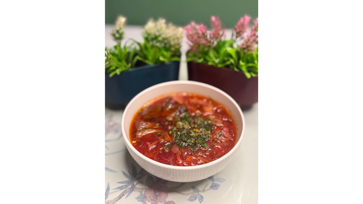 Насыщенный свекольный суп с говядиной, капустой, картофелем, морковью и луком, подается со сметаной.