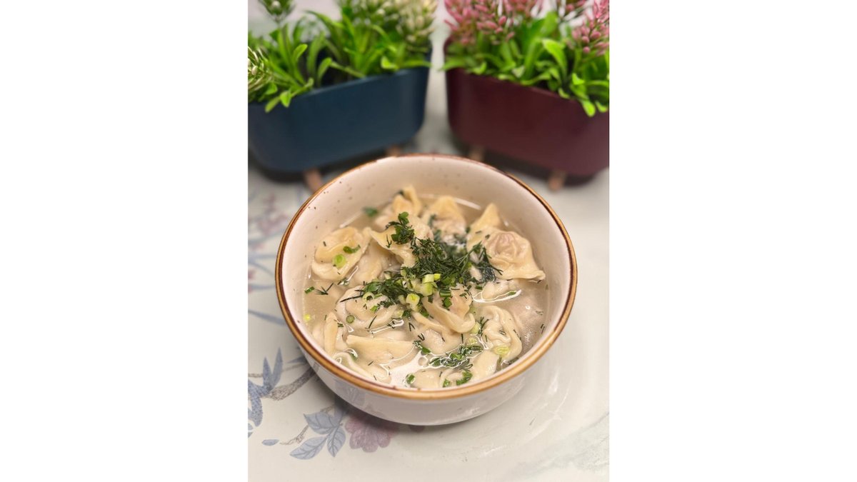 Традиционный бульон с ароматными пельменями из говядины и зеленью и специями.