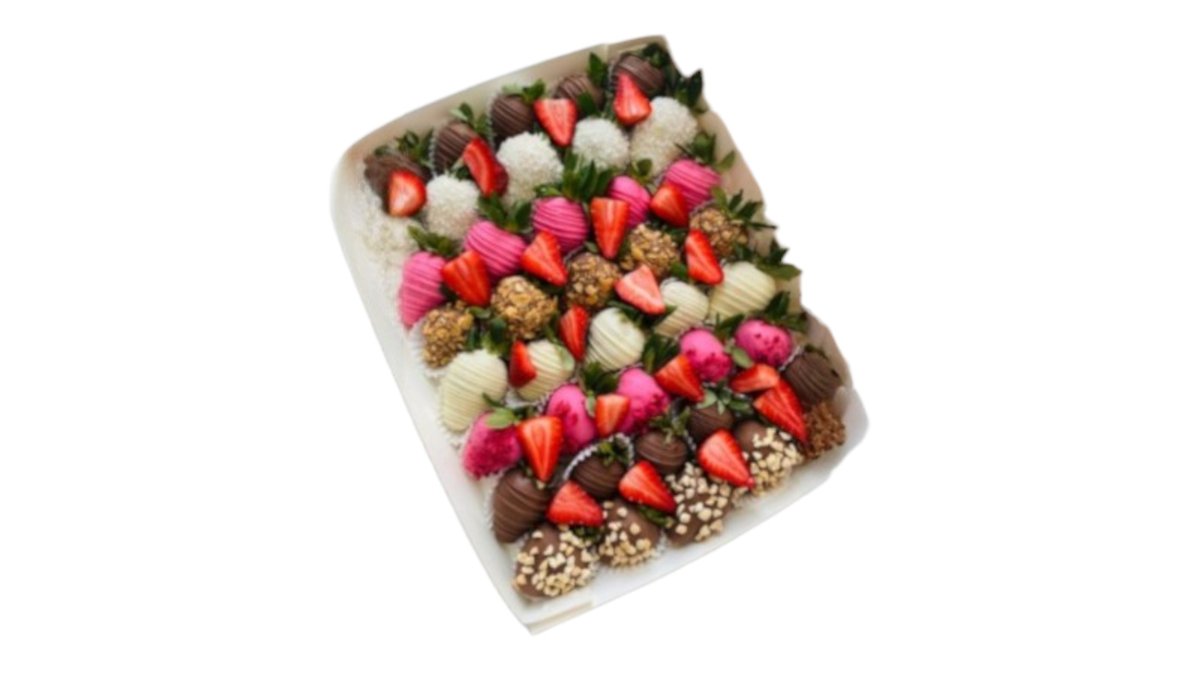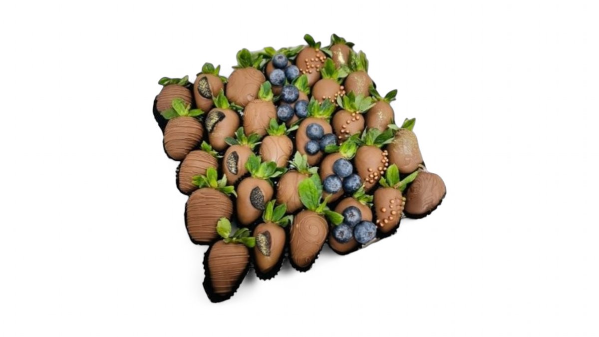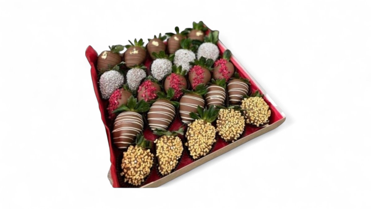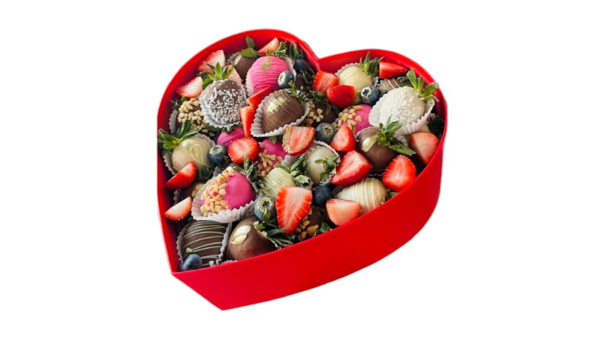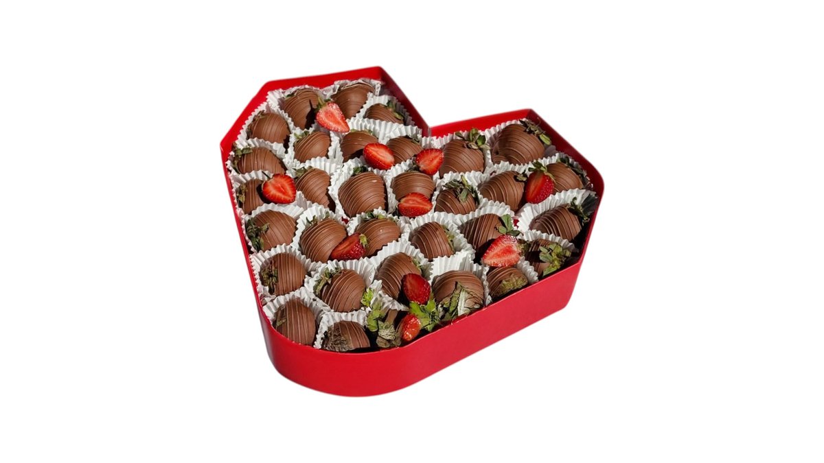 Сет Красное сердце 33шт клубники в молочном бельгийском шоколаде декорирован свежей клубникой