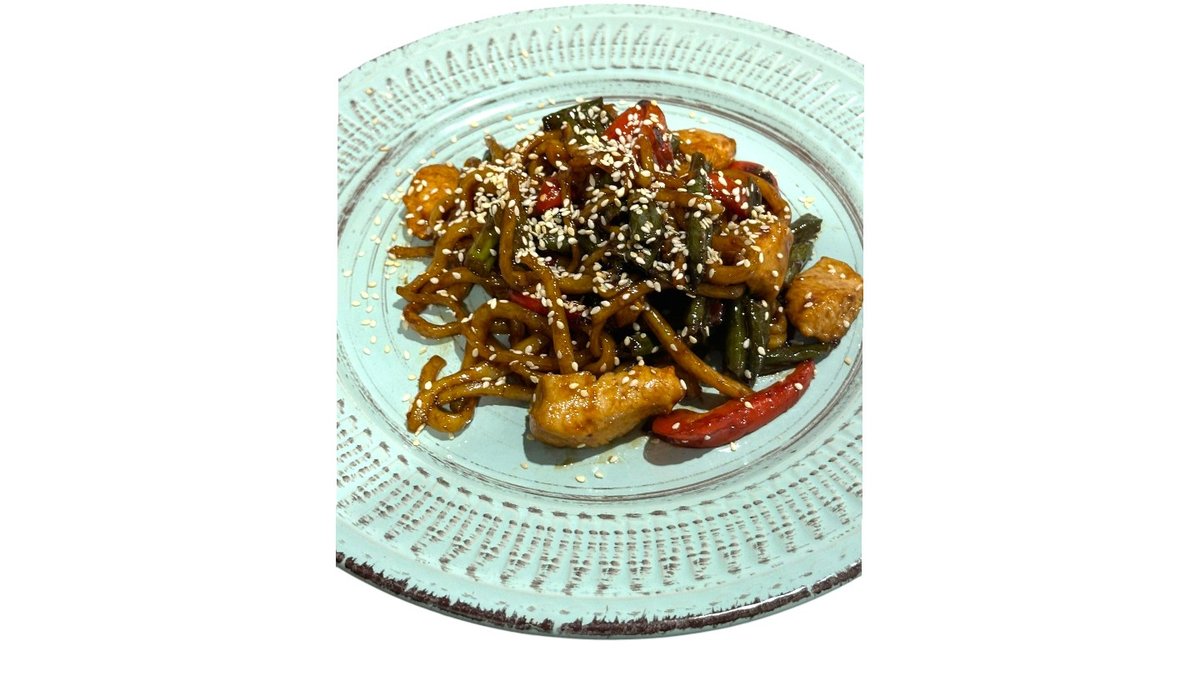 Лапша ручной работы обжаренная с овощами и курицей с добавлением кисло-сладкого соуса чили.
