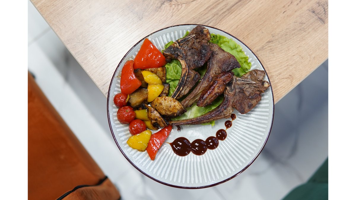 Поджаренный харис, говяжья ветчина, запеченная куриная грудка ,тар-тар, салат айсберг и горчичный соус.