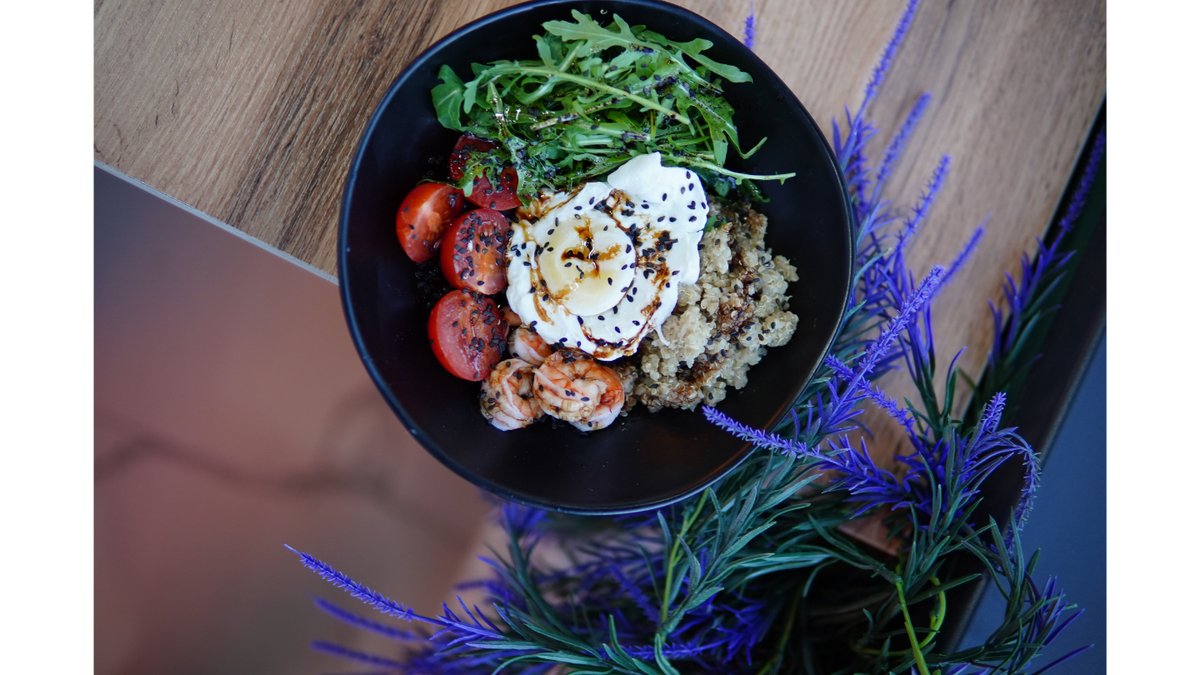 Креветки, обжаренный на сливочном масле, киноа, руккола, вяленные помидоры и яйцо пашот