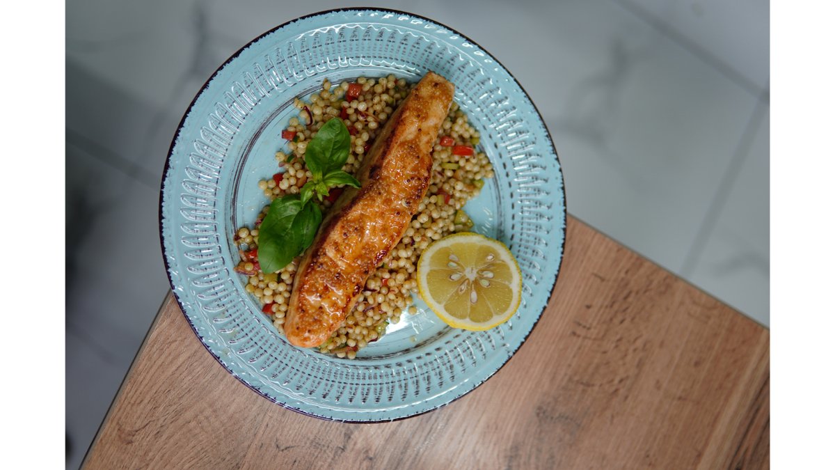 Микс салата с слабосоленной семгой, броколли и помидорами черри, заправленный соусом на основе кешью, подается с тыквенными семечками.