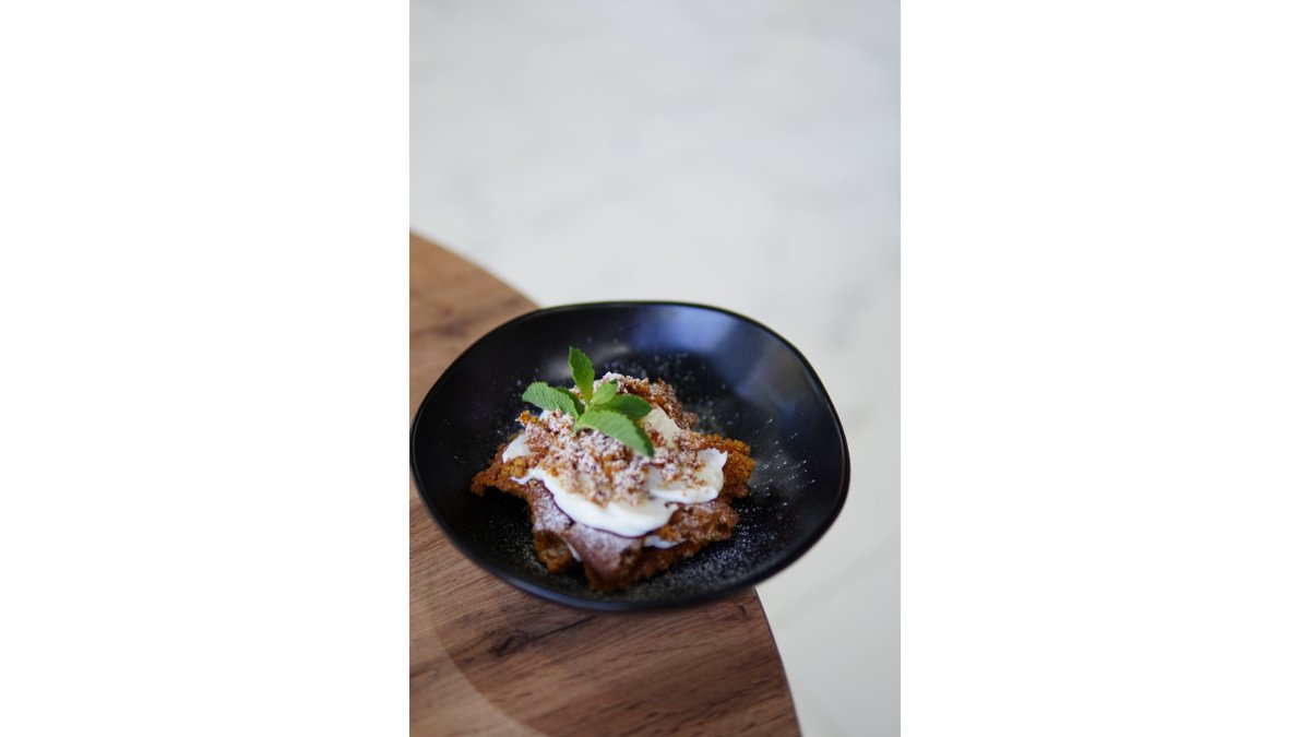 Поджаренный багет, смазанный творожным сыром,поддается с маринованным запеченным болгарским перцем,рубленой мятой и грецким орехом