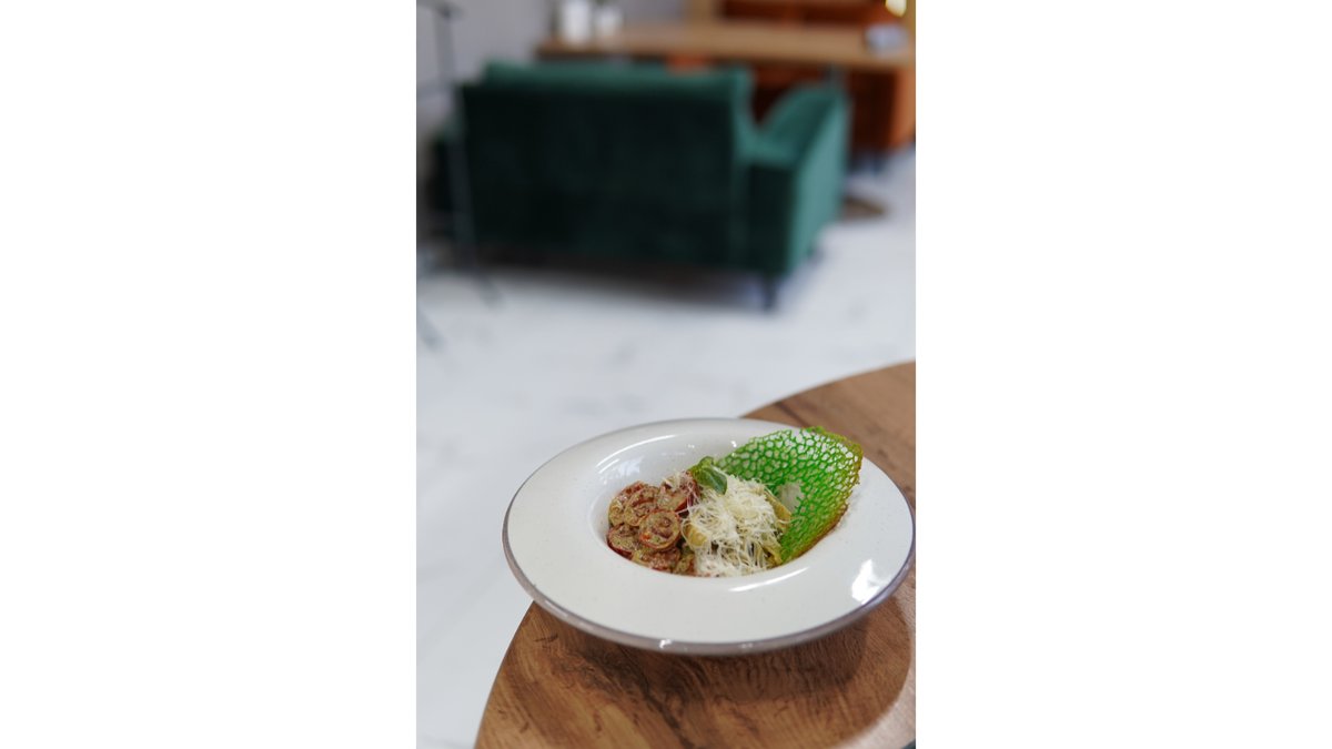 паста фетучини подается с помидорами черри обжаренными на сливочном масле с соусом песто и пармезаном.