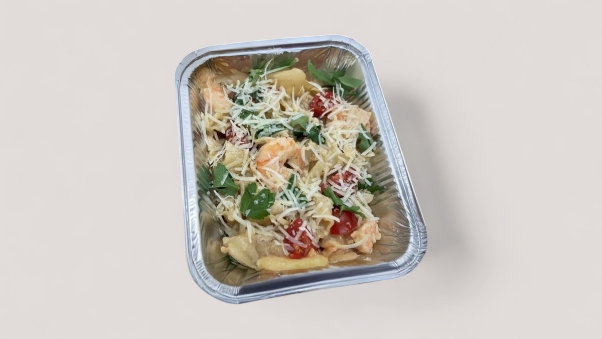 Креветки тигровые, бульон Том ям, шампиньоны, сливки, томаты черри, кинза