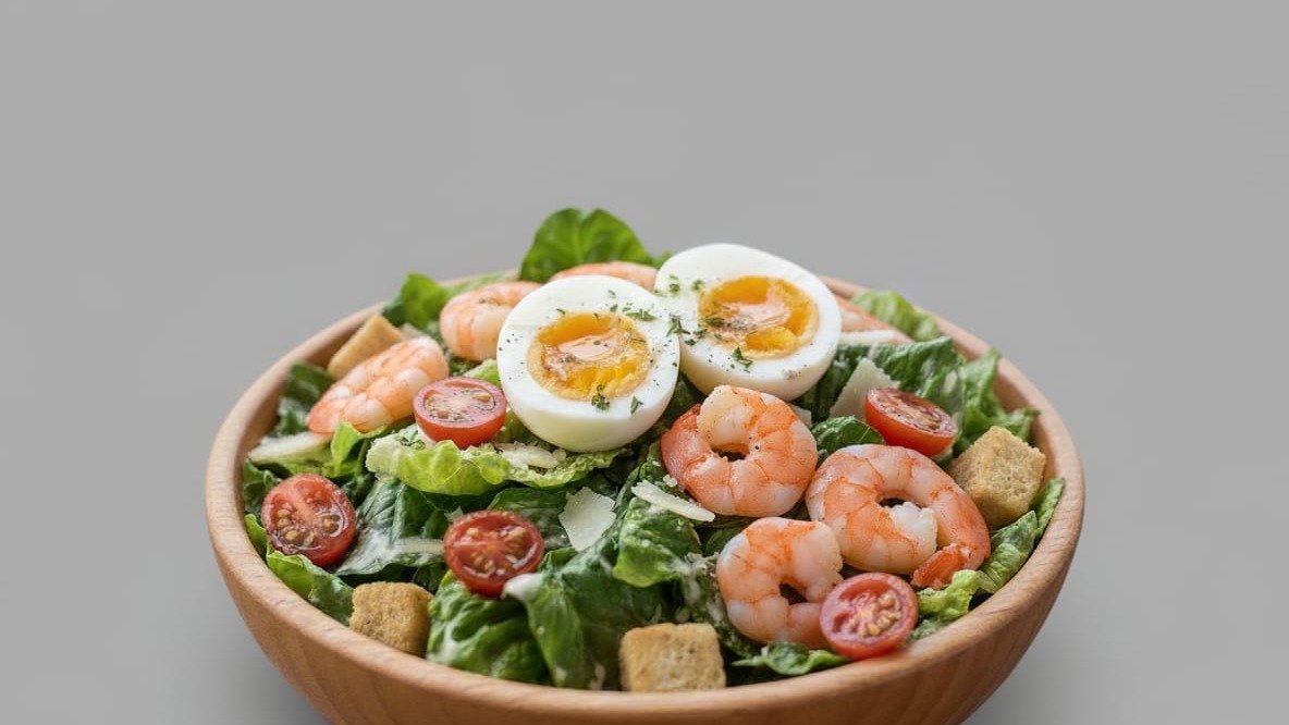 креветка, салат айсберг, пармезан, яйцо, сухари, помидоры черри